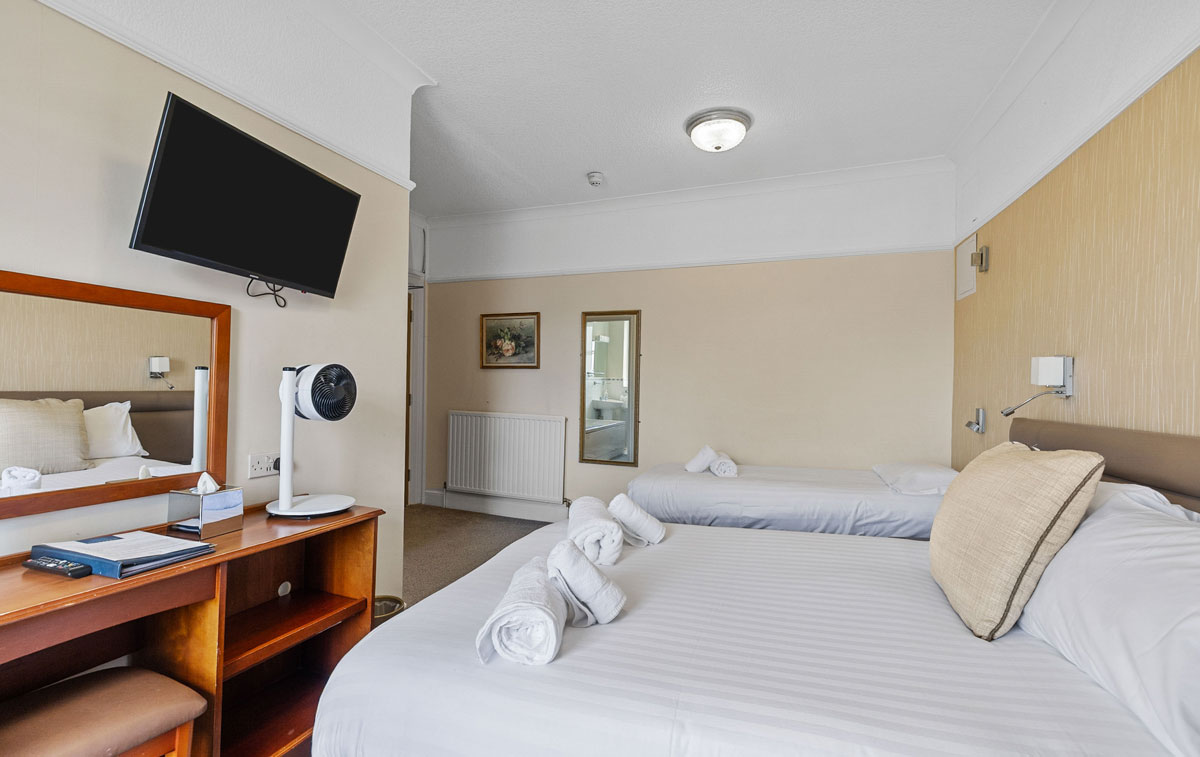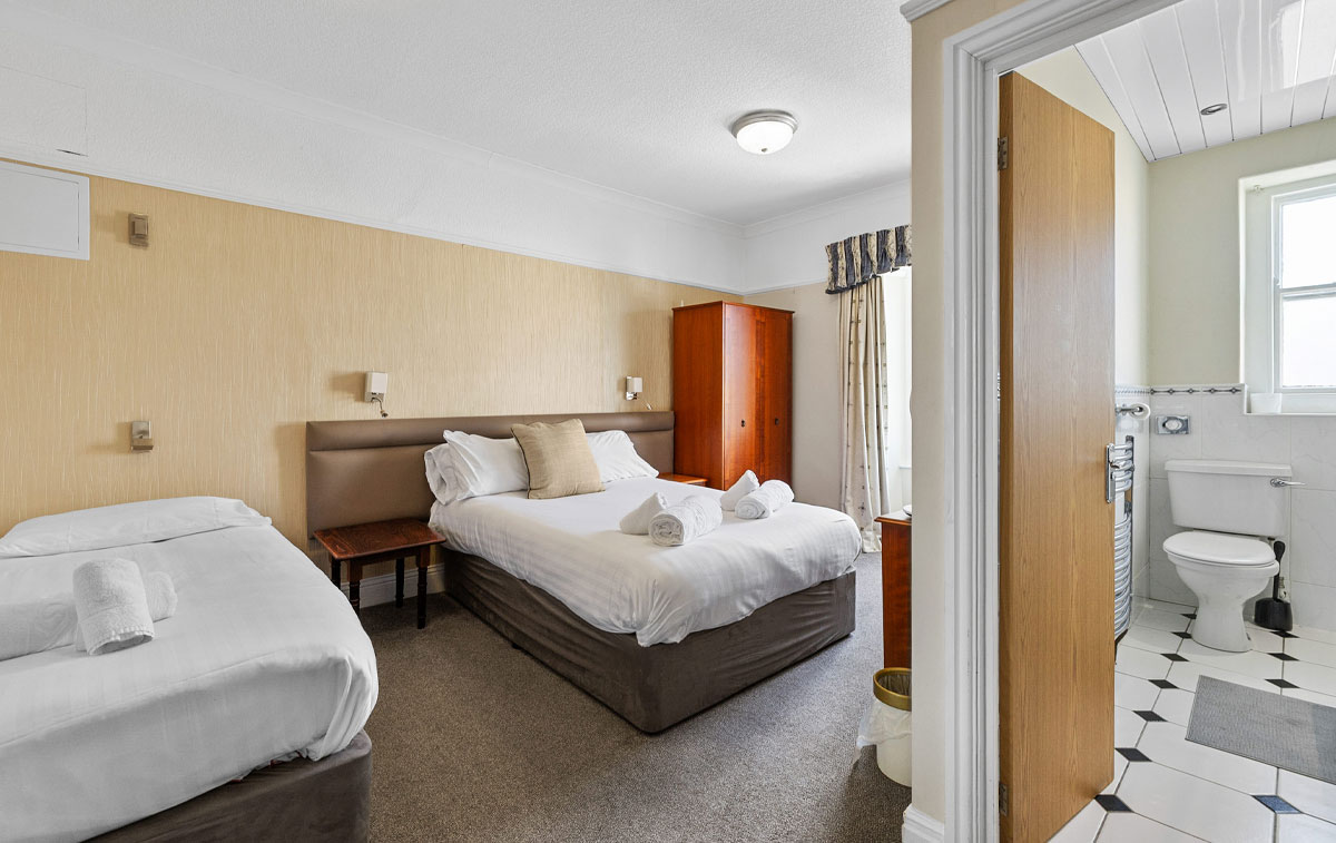 Spacious and adaptable, our Triple rooms provide comfortable accommodation for groups of three, consisting of a single bed and one large double bed. Whether you're a small family or friends exploring Plymouth together, these rooms ensure everyone enjoys a restful night's sleep.